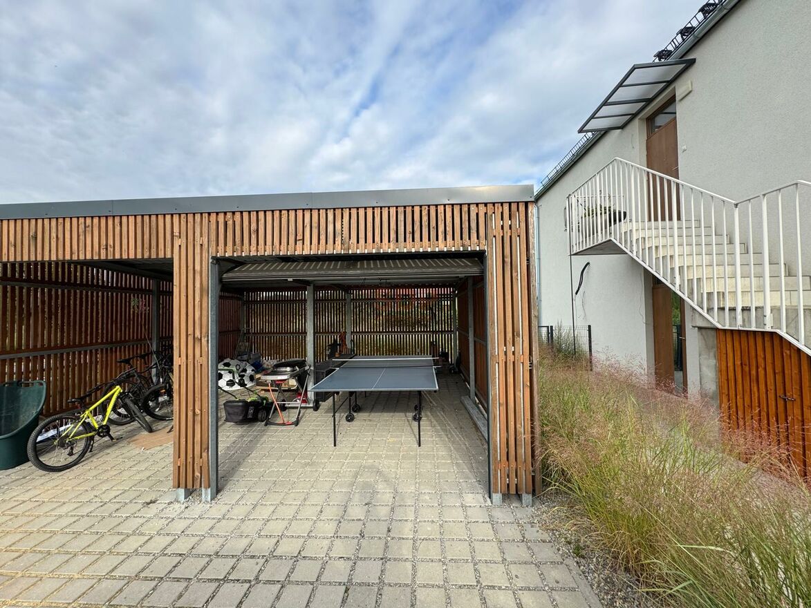 Dwa miejsca postojowe: jedno w wiacie (zamykanej), drugie przed wiatą